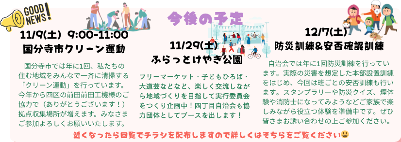 - 四丁目自治会は国分寺市と防災推進地区の協定をむすび、避難時対応など地域防災計画をつくって活動しています。避難訓練など地域防災に関心の有る方、発災・避難時に実働できる方を募集しています。